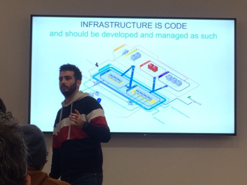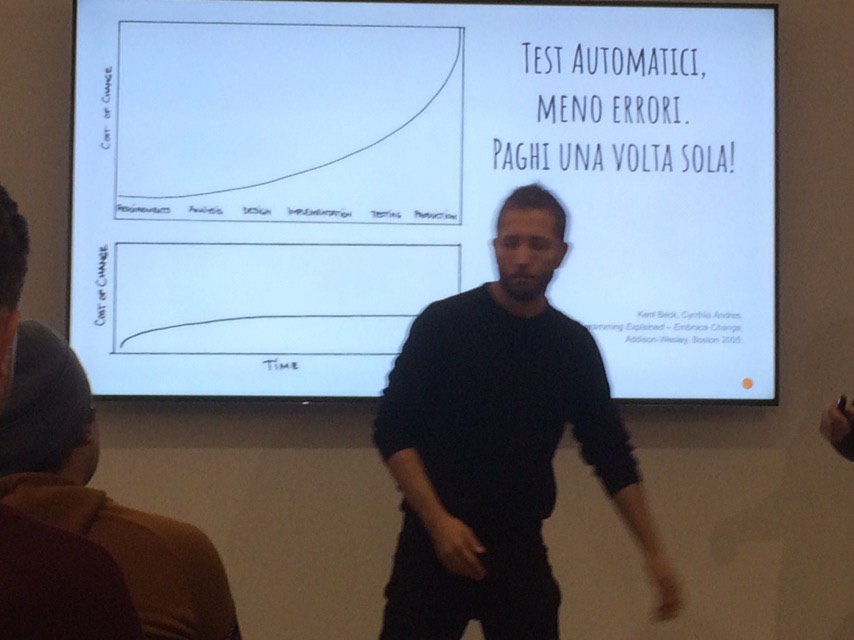 Il tema della serata è stata una introduzione al mondo DevOps, mostrando cos’è e in che scenario si colloca, spiegando perché volerlo adottare, mostrandone sia i vantaggi tecnici che economici. Jacopo ha invece parlato del debito tecnico e dei costi marginali, due problemi che le pratiche DevOps tendono a contrastare.
