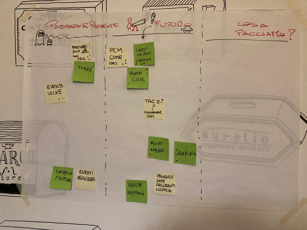 Da qui abbiamo disegnato una board fisica, inserito i nostri spunti su postit e, una volta votati con il dot voting e ordinati, abbiamo conversato su questi temi.